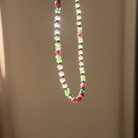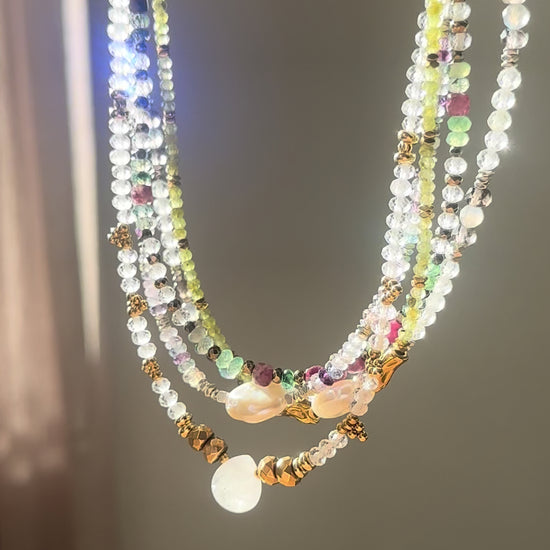 Collier Cristal de Roche, Agate Mousse, Tourmaline rose & Pyrite – Harmonie, enracinement et lumière