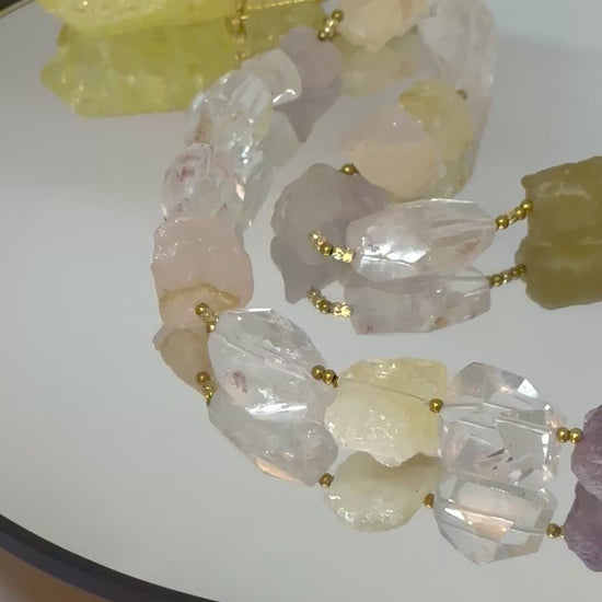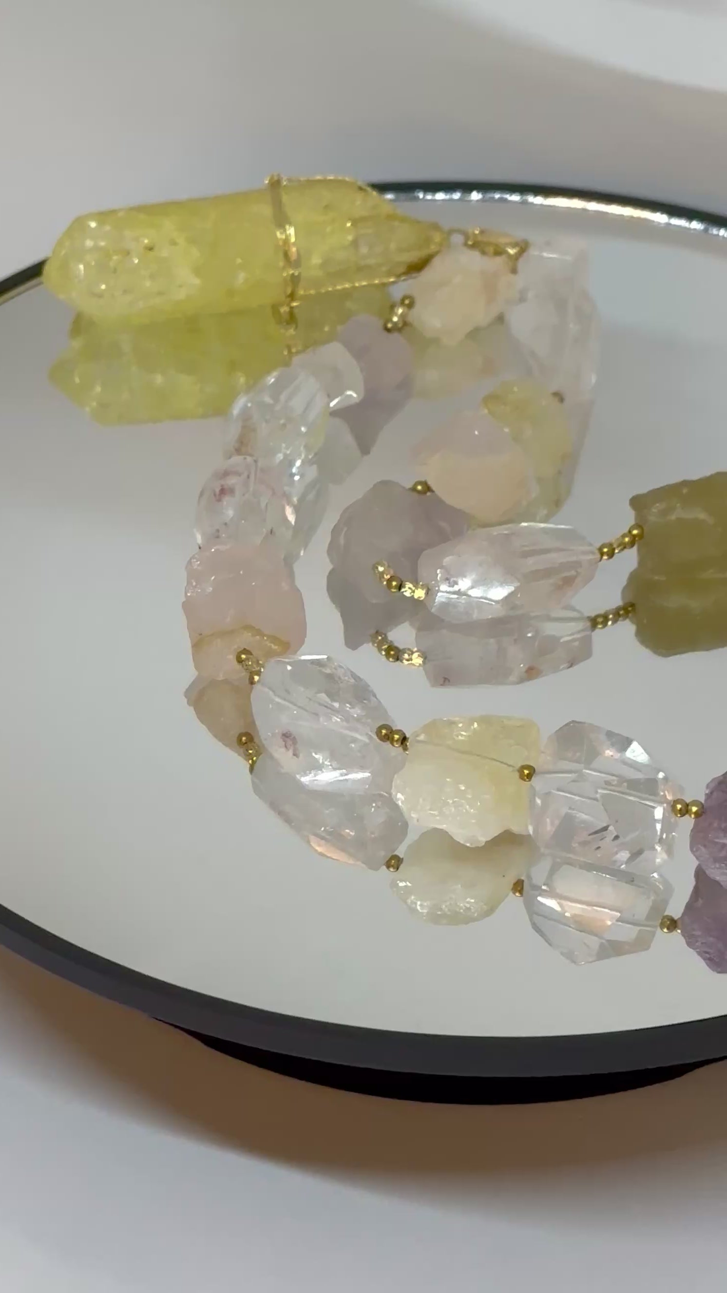 Ce collier réunit les vibrations des quartz dans une symphonie d’énergie pure. Le Cristal de Roche agit comme amplificateur naturel, clarifiant et harmonisant l’ensemble. Associé à divers Quartz colorés, il crée une onde de vitalité équilibrée entre douceur émotionnelle et ancrage lumineux.
