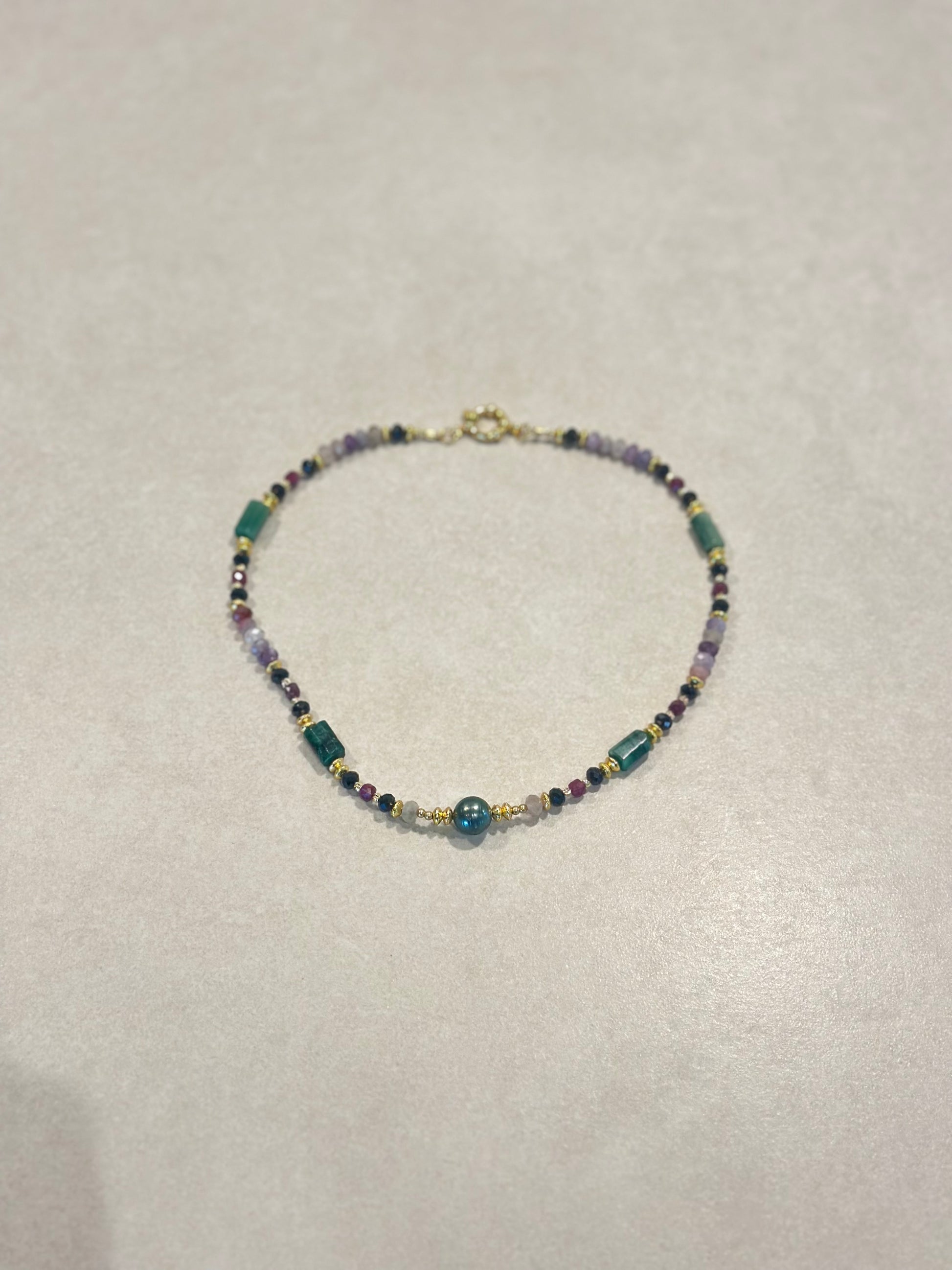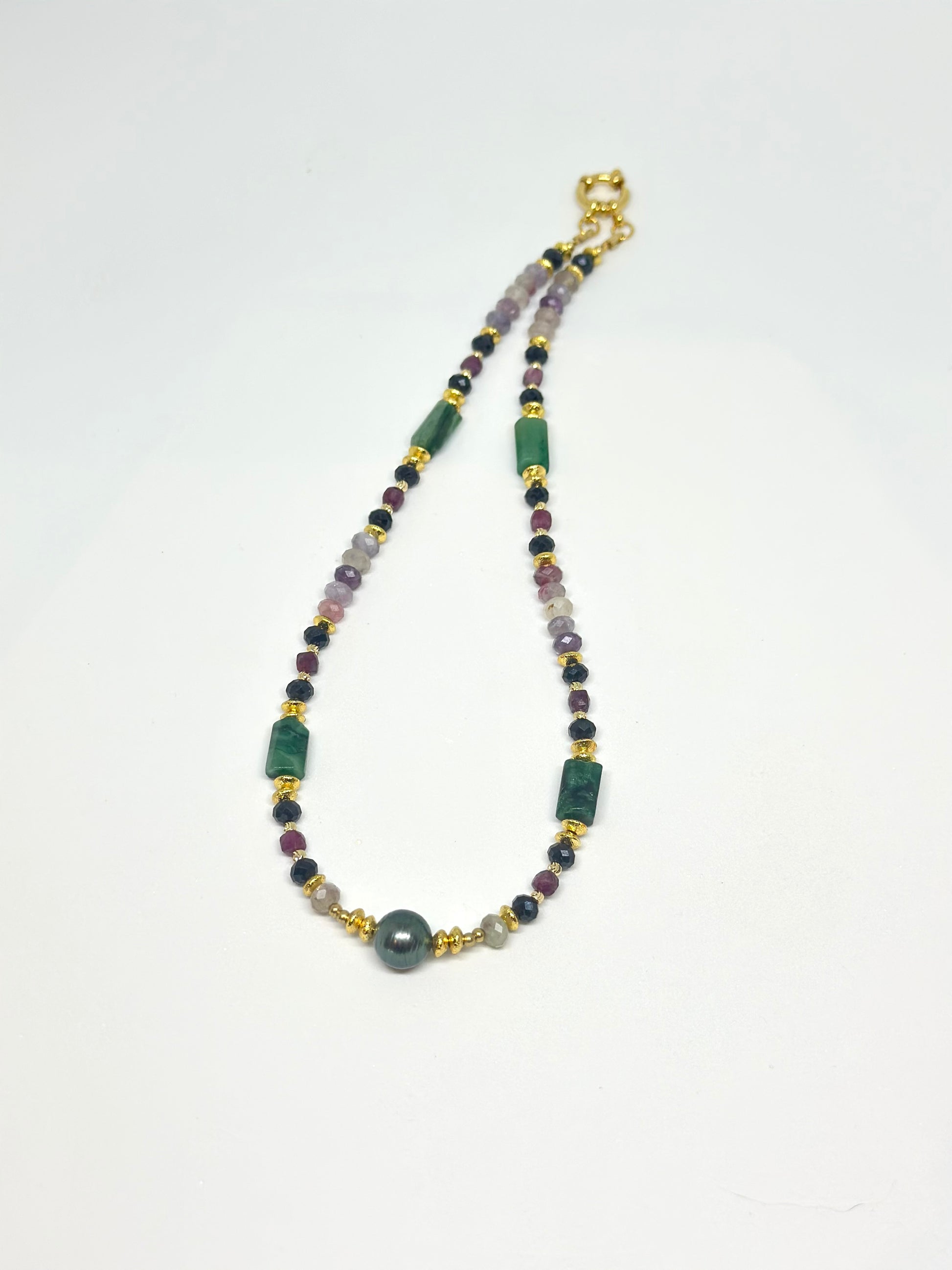 Ce collier réunit la force protectrice de la Tourmaline à la douceur vibrante de l’Émeraude, avec l’éclat profond d’une Perle de Tahiti.