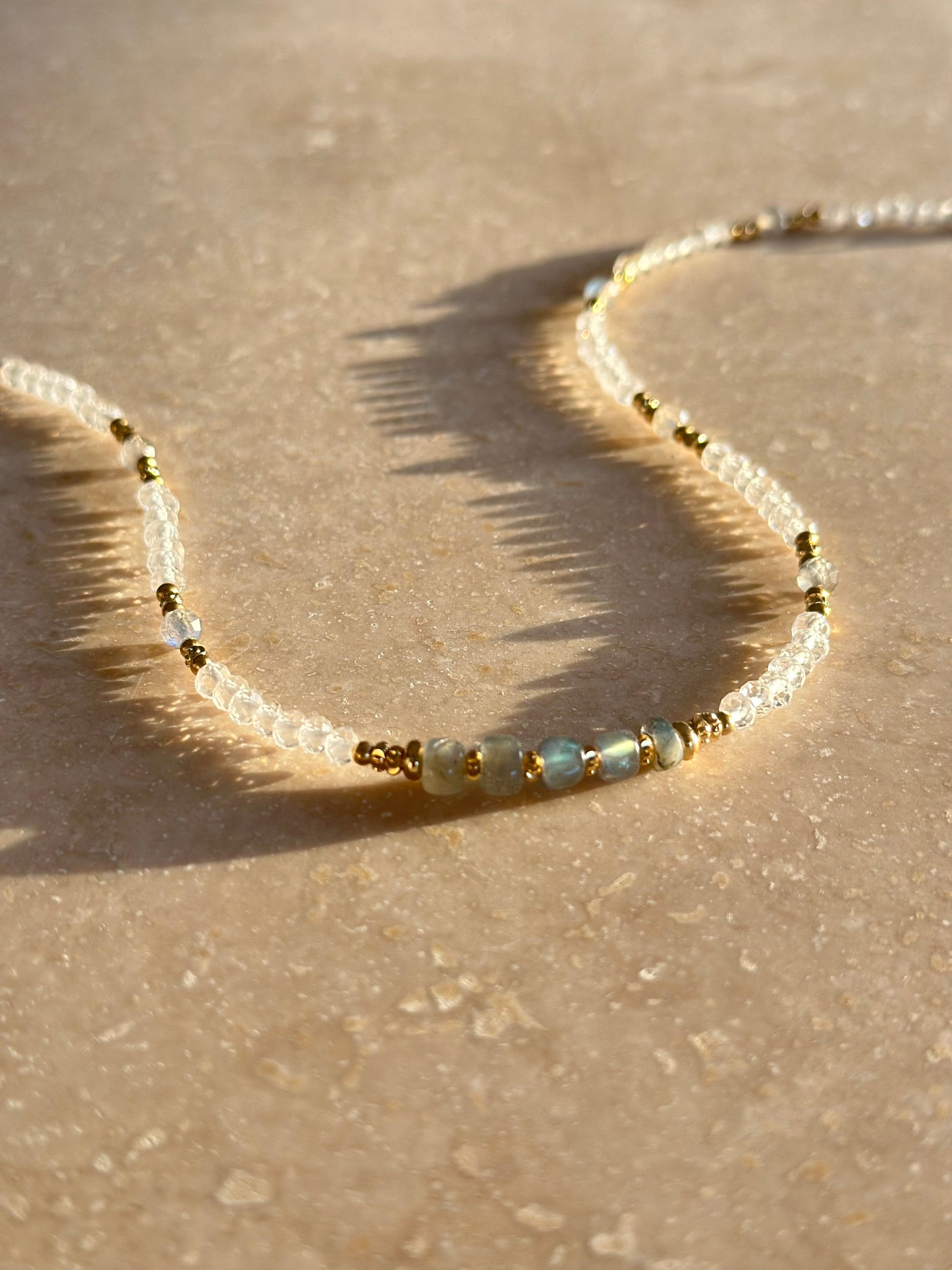 Union de la lumière pure et du voile protecteur, l’alliance du cristal de roche et de la labradorite amplifie les énergies tout en préservant leur intégrité. Le cristal de roche élève la vibration, clarifie la pensée et agit comme un canal limpide vers les plans supérieurs, tandis que la labradorite crée un champ de protection et guide l’intuition.