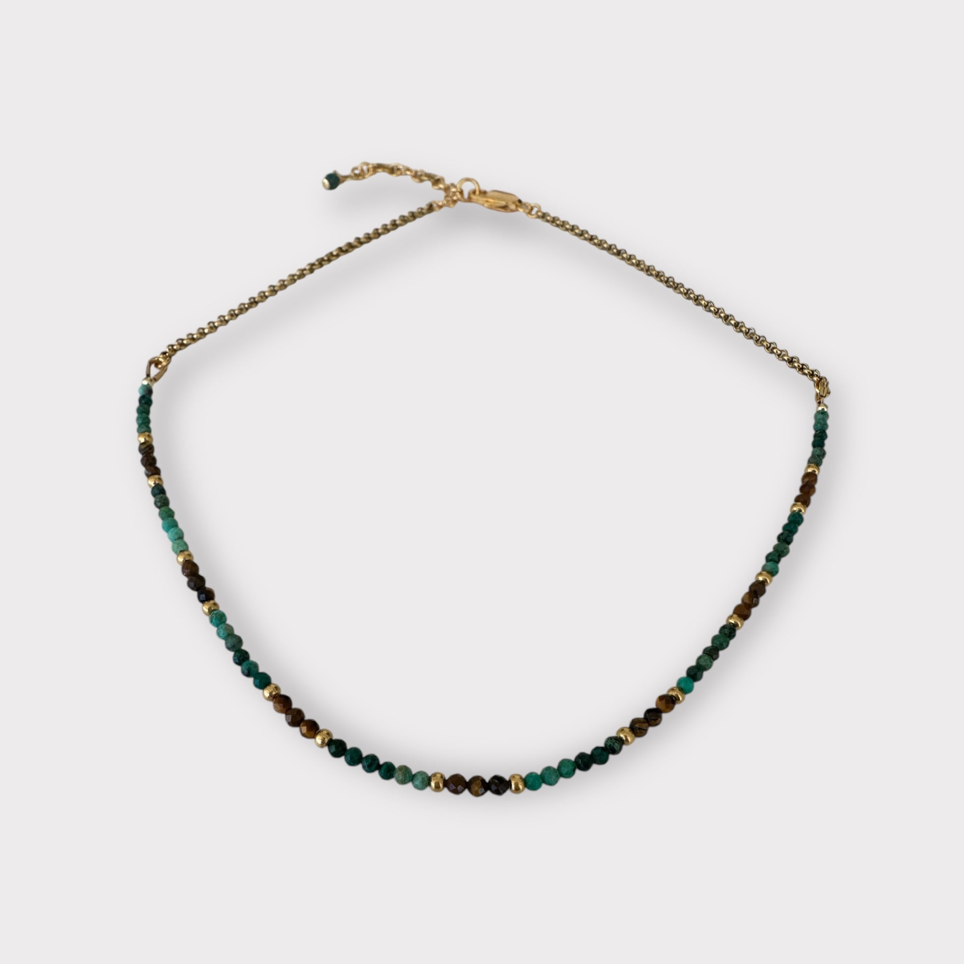 L’association Turquoise africaine (Yin, chakra gorge) et Œil de tigre (Yang, chakra plexus solaire) guide vers l’harmonie entre l’expression de soi et la force intérieure.