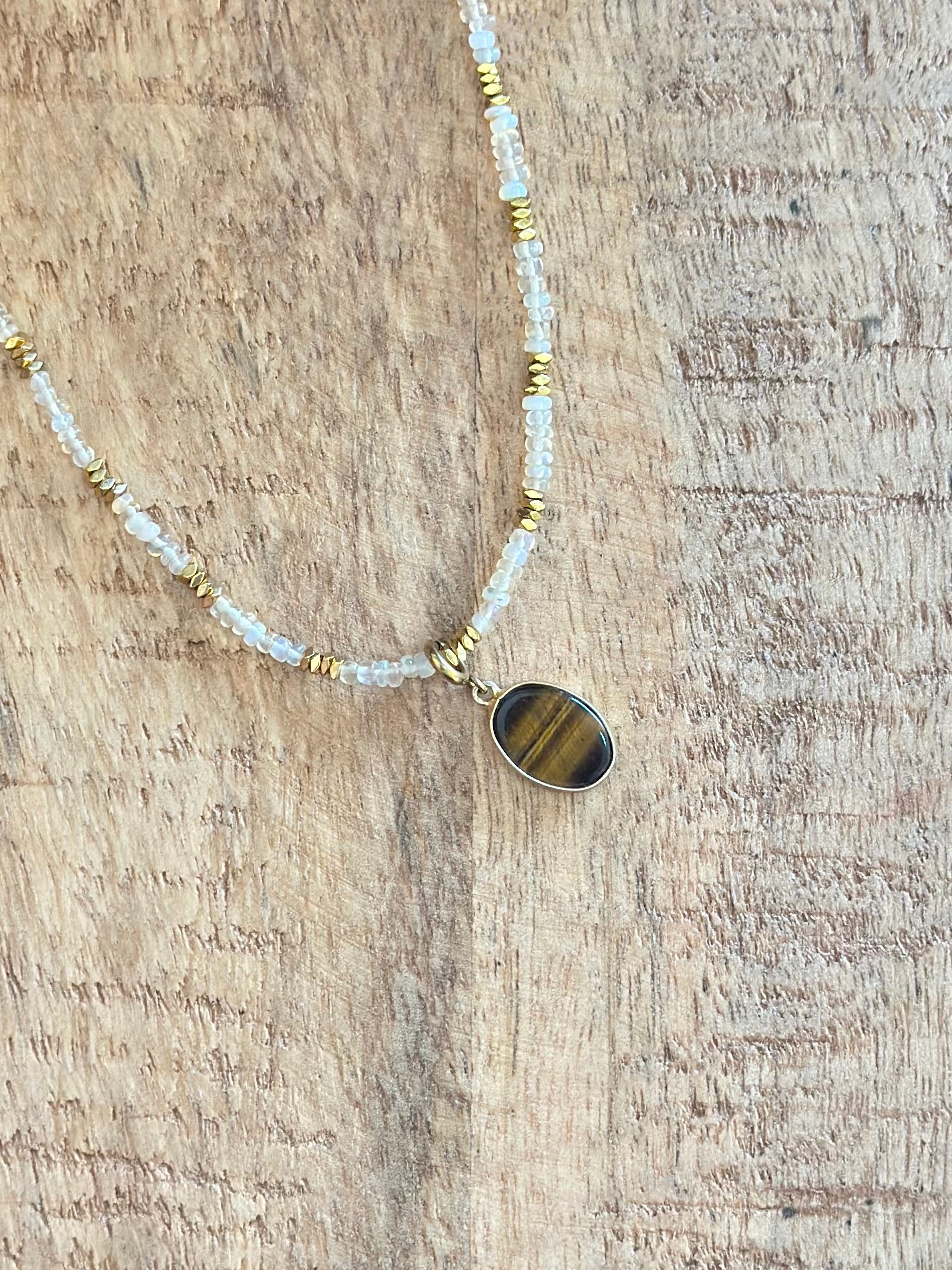 - Pendentifs : Nacre noire placage doré, cristal de roche placage doré et œil de tigre serti laiton (voir descriptif)