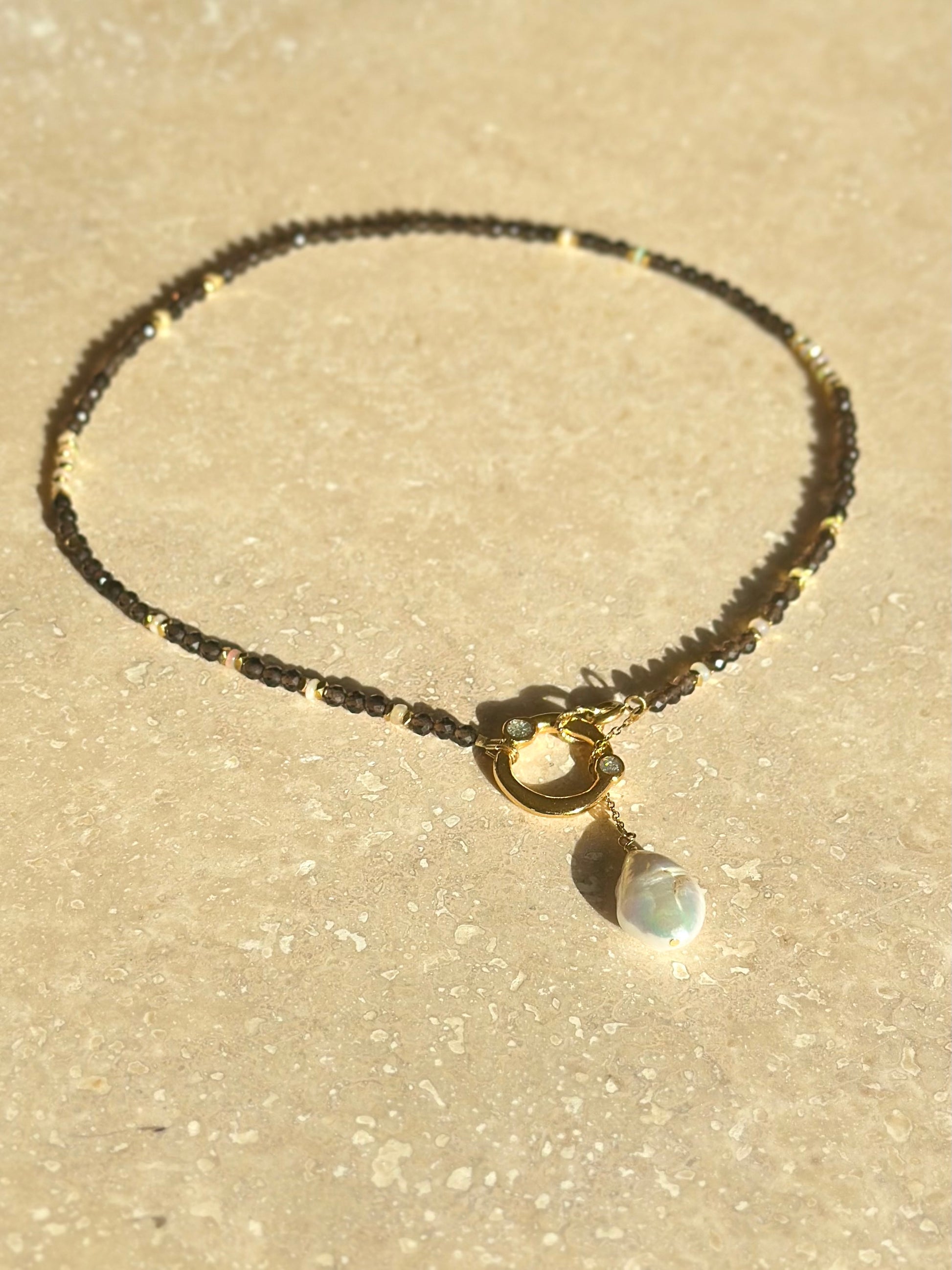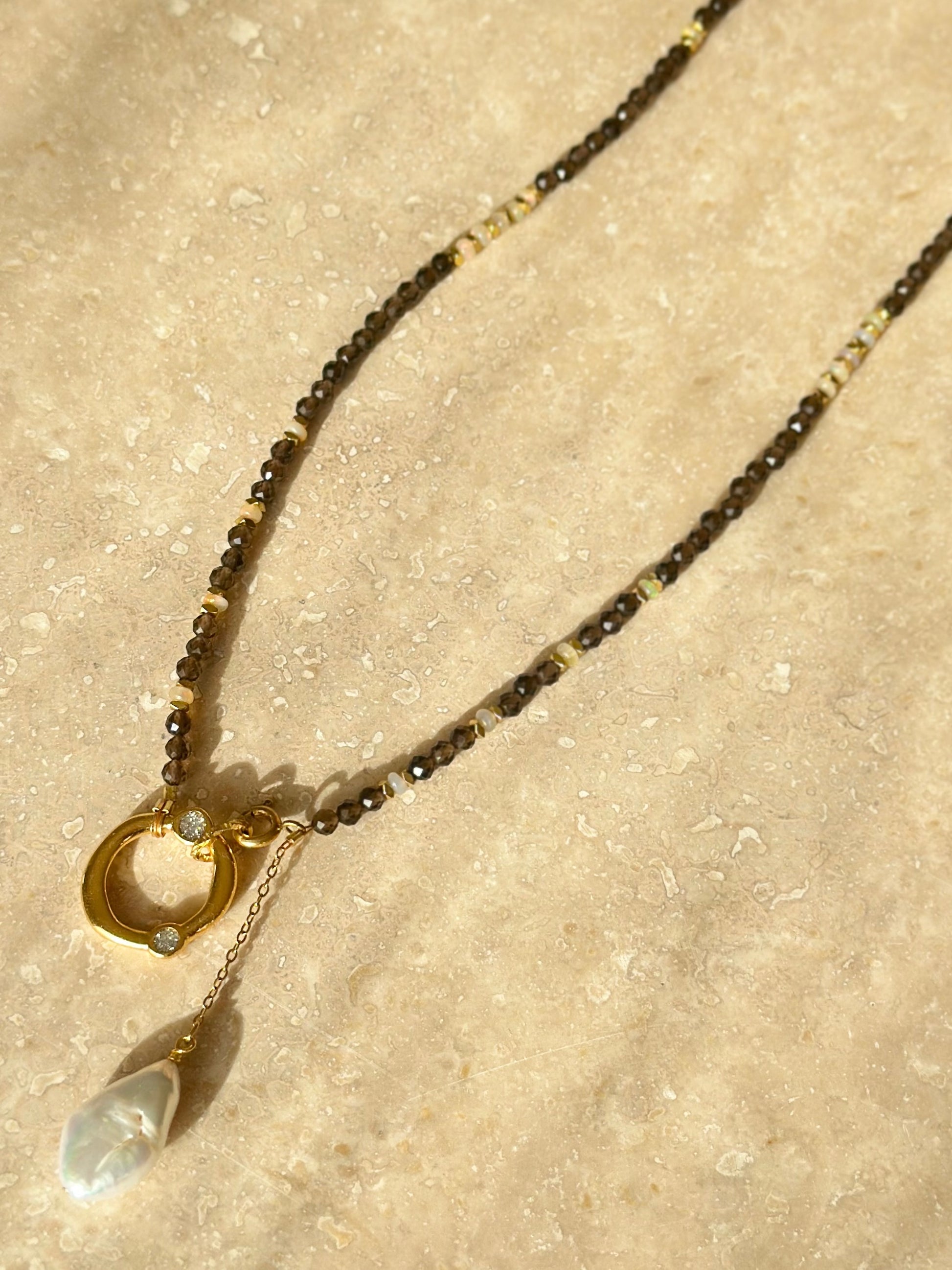 Alliance de stabilité et de lumière intérieure, le quartz fumé et l’opale d’Éthiopie équilibrent enracinement et élévation. Le quartz fumé dissipe les énergies lourdes, renforce la connexion à la Terre et stabilise le corps et l’esprit, tandis que l’opale d’Éthiopie éveille la sensibilité, l’intuition et la perception subtile des flux énergétiques.